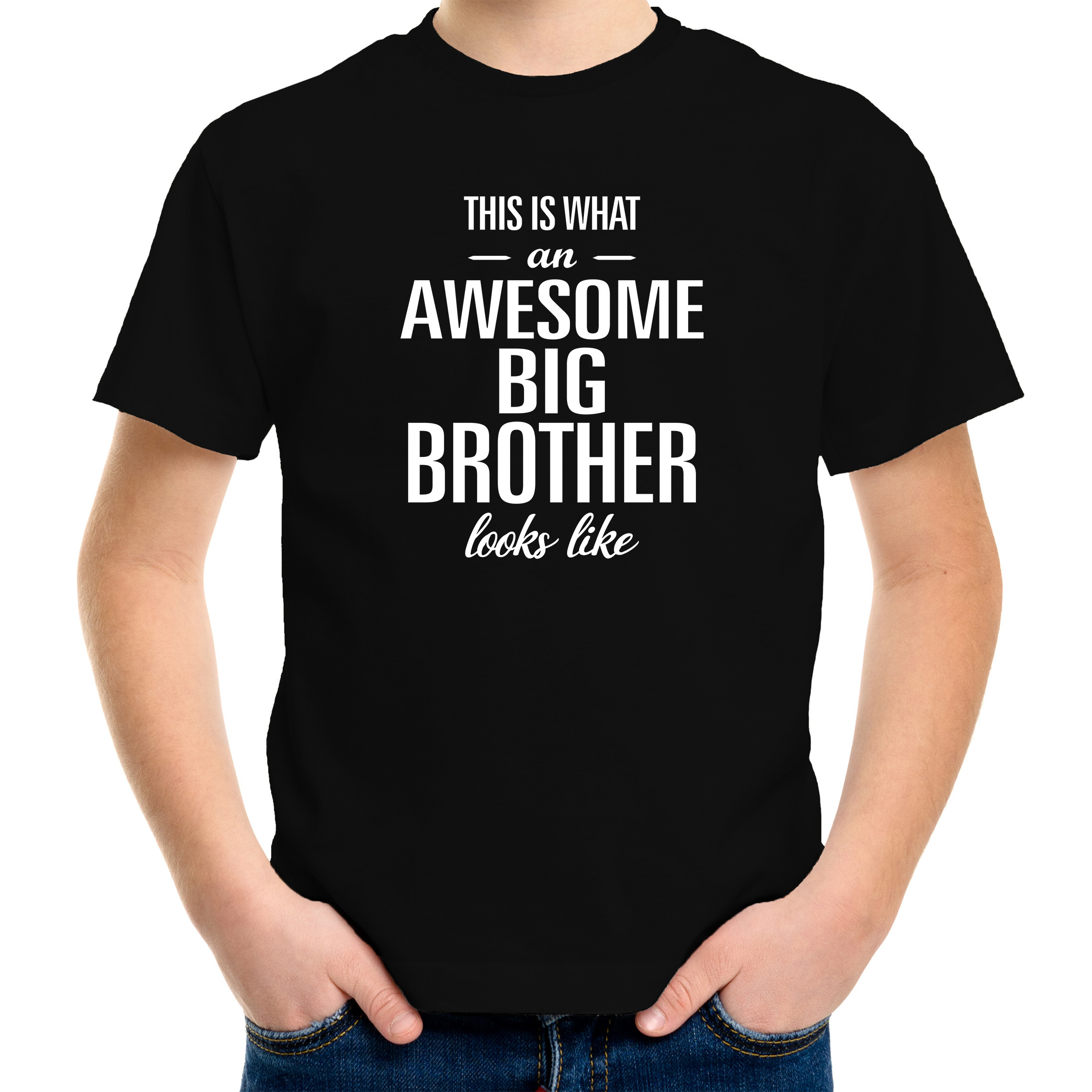 Awesome big brother/ grote broer cadeau t-shirt zwart voor jongens / kinderen. Op dit zwarte kado shirt staat in witte letters de tekst: This is what an awesome big brother looks like. Leuk t-shirt voor bijvoorbeeld bij de aankondiging van een toekomstig broertje of zusje.