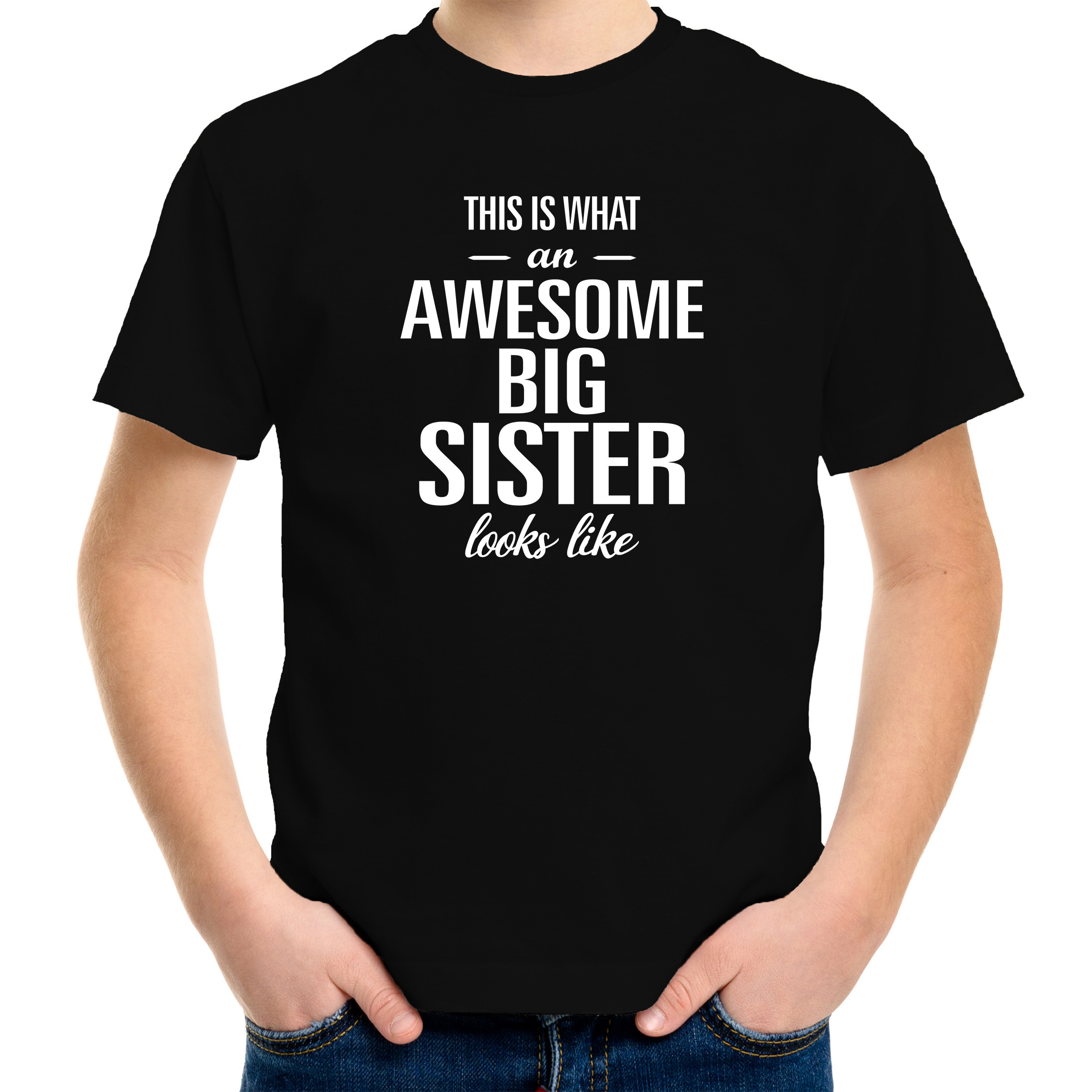 Awesome big sister/ grote zus cadeau t-shirt zwart voor meisjes / kinderen. Op dit zwarte kado shirt staat in witte letters de tekst: This is what an awesome big sister looks like. Leuk t-shirt voor bijvoorbeeld bij de aankondiging van een toekomstig broertje of zusje.