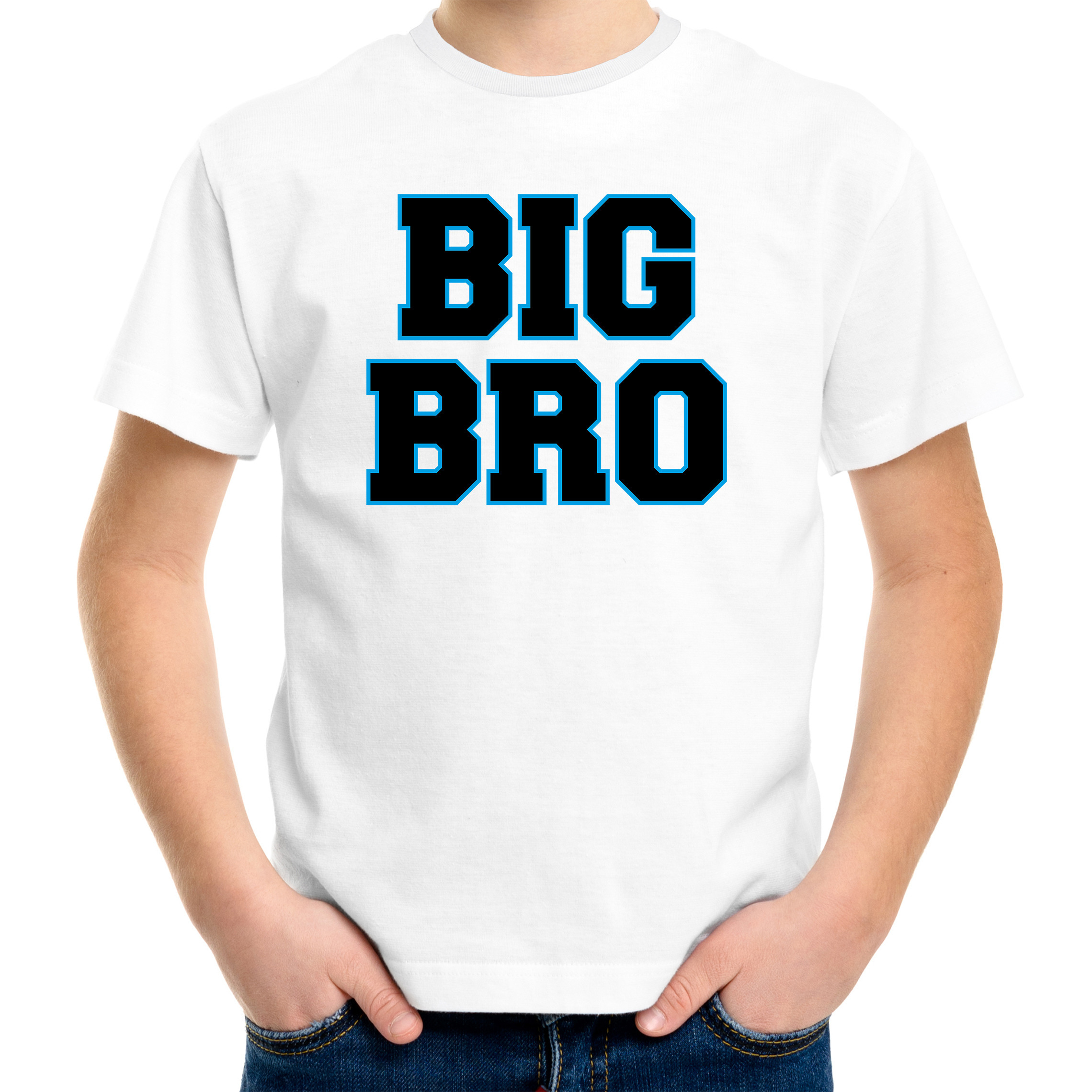 Big bro grote broer cadeau t-shirt wit voor jongens / kinderen. Op dit witte kado shirt staat in grote zwarte letters met blauwe omlijning de tekst: Big bro. Leuk t-shirt voor bijvoorbeeld bij de aankondiging van een toekomstig broertje of zusje.
