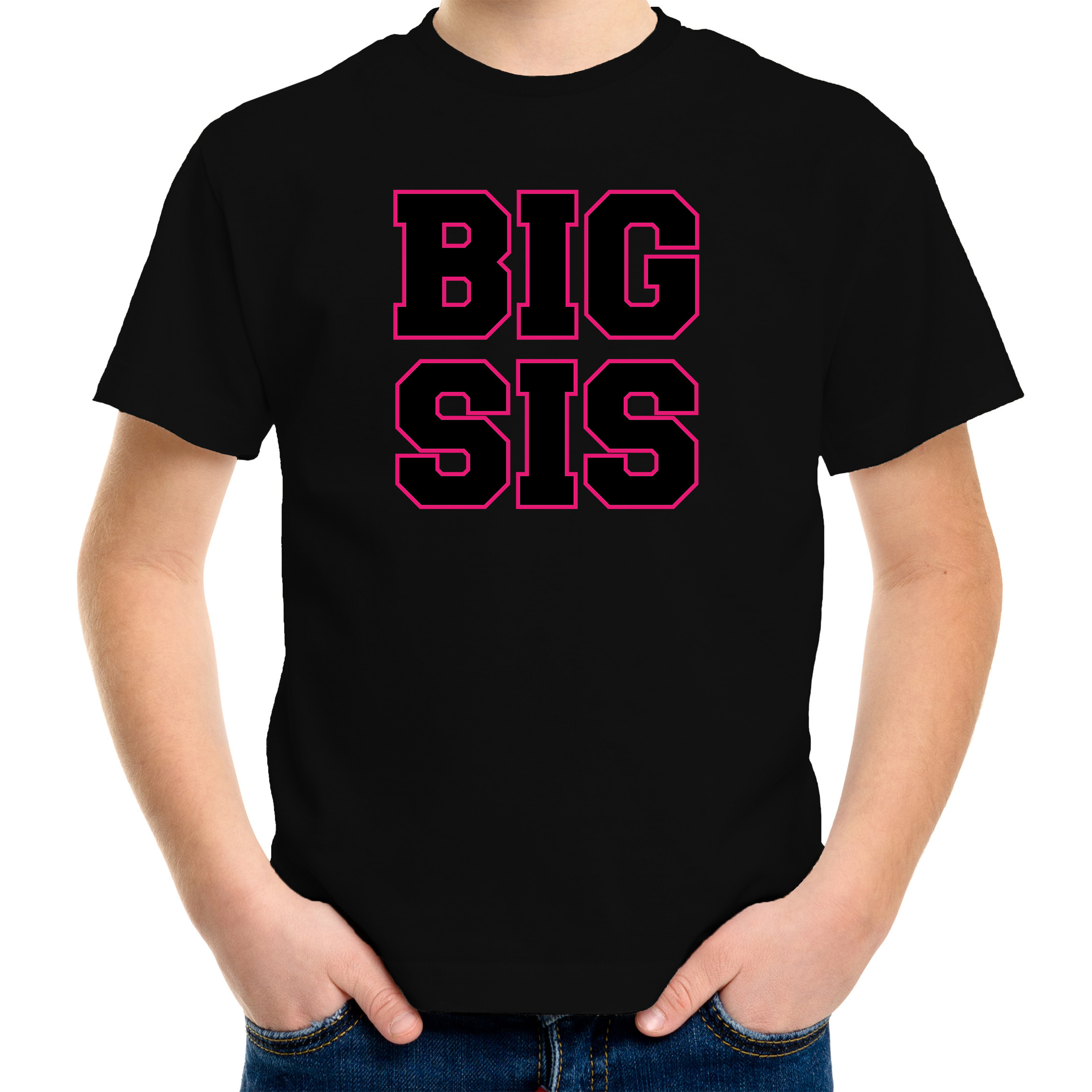 Big sis grote zus cadeau t-shirt zwart voor meisjes / kinderen. Op dit zwarte kado shirt staat in grote roze omlijnde letters de tekst: Big sis. Leuk t-shirt voor bijvoorbeeld bij de aankondiging van een toekomstig broertje of zusje.