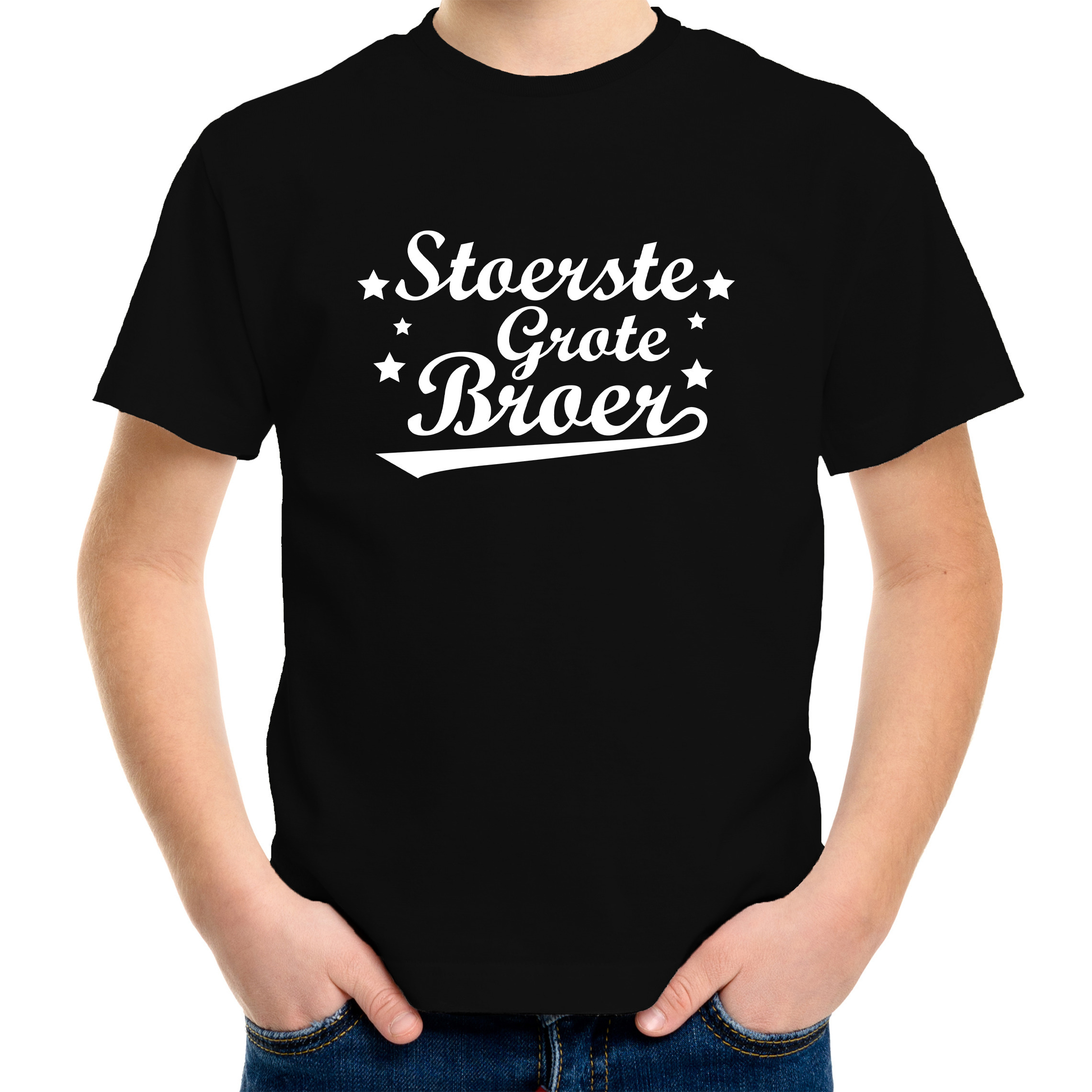 Stoerste grote broer cadeau t-shirt zwart voor jongens / kinderen. Op dit zwarte kado shirt staat in witte letters met sterretjes de tekst: Stoerste grote broer. Leuk t-shirt voor bijvoorbeeld bij de aankondiging van een toekomstig broertje of zusje.